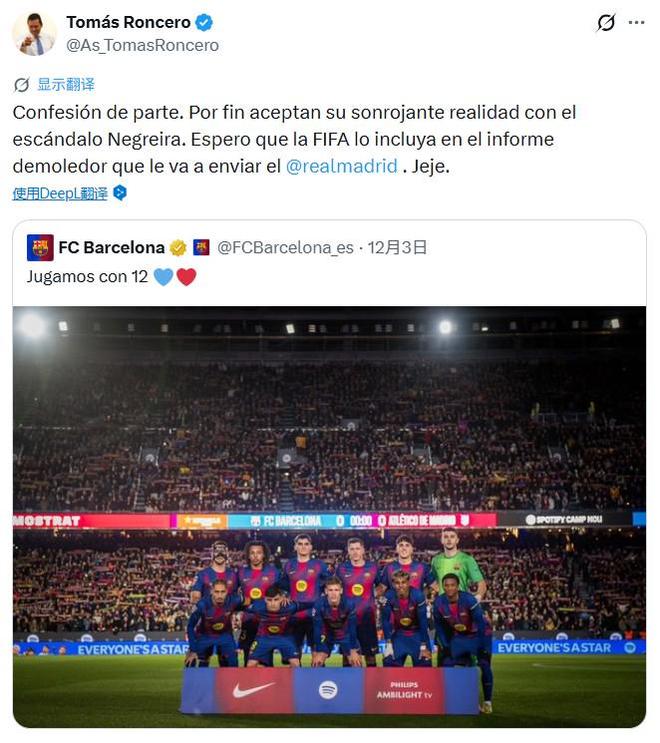龙赛罗转发巴萨“第12人”贴文:他们承认了内格雷拉丑闻